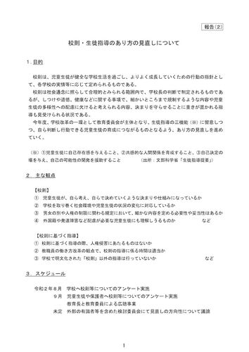 本日の教育委員会会議資料の一つ、「校則・生徒指導のあり方の見直しについて」です。 資料にもあるように、文科省が示す生徒指導の三機能、①児童生徒に自己存在感を与えること、②共感的な人間関係を育成すること、③自己決定の場を与え、自己の可能性の開発…