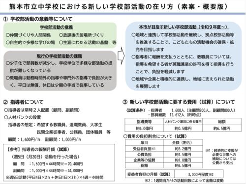 熊本市立中学校の「新しい学校部活動」の素案を公表しました。 希望者のみが指導し、報酬を得る仕組みへと転換します。また、人材バンクを設置して、地域で支える持続可能な学校部活動を実現します。 およそ2年にわたり多くの関係者が検討してきた結果が形に…